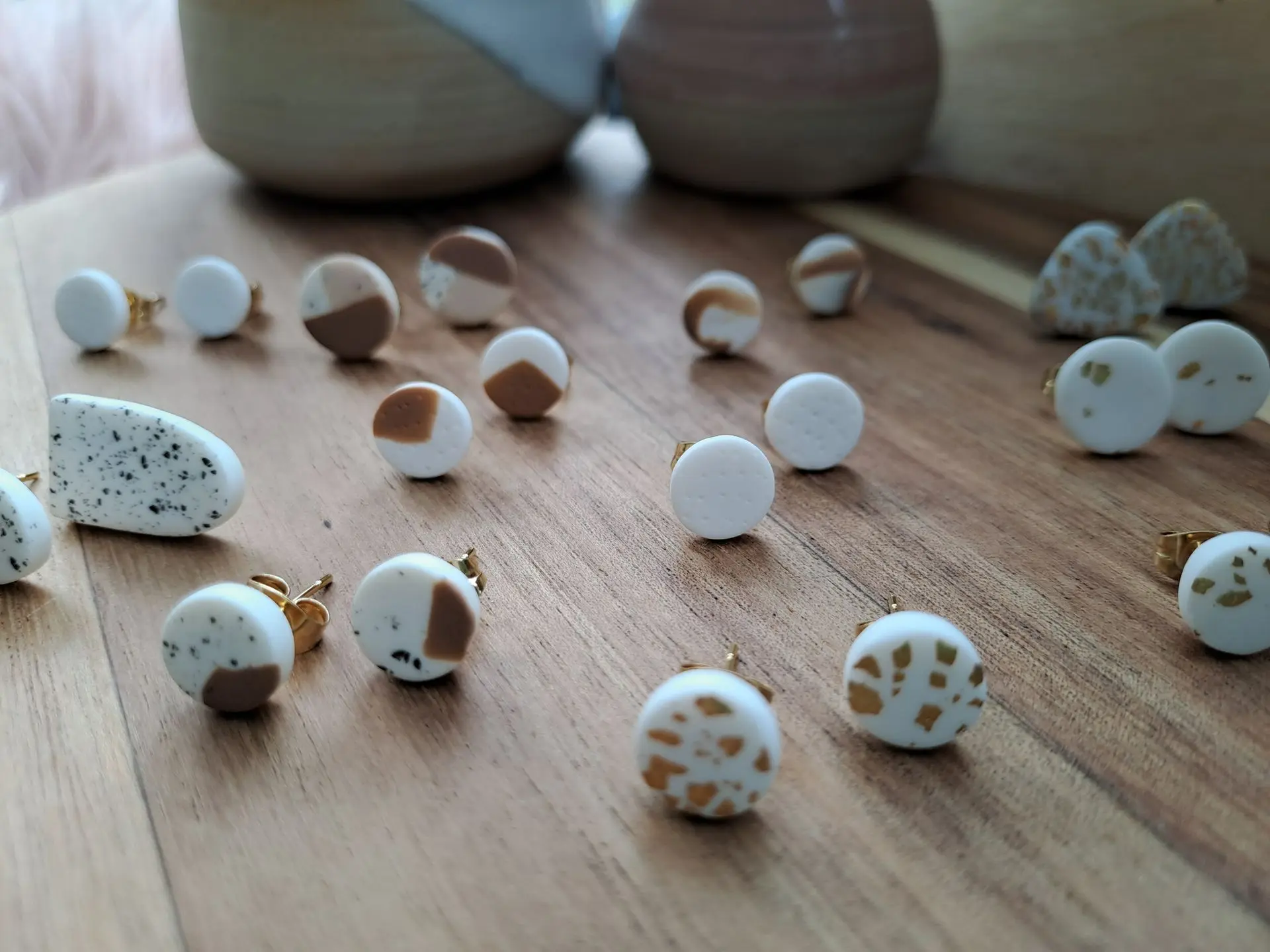We maken in hoofdzaak oorringen uit polymeer klei. Alle kleistukjes worden handgemaakt in ons atelier in Ruiselede (tussen Gent en Brugge). Elke collectie oorringen draait om een zelfgemaakte kleur polymeer klei in verschillende tinten en schakeringen. We combineren onze stukjes klei met hypoallergene metalen om unieke oorringen te maken. Op aanvraag maken we ook halskettingen of armbandjes.