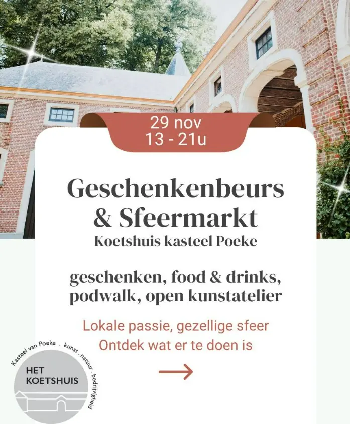 Je vindt er tal van geschenken, er is ook een mooi aanbod van food & drinks, je kan een combinatie doen met de podwalk in het Poekebos en het kunstatelier in het Koetshuis opent voor de gelegenheid ook de deuren.